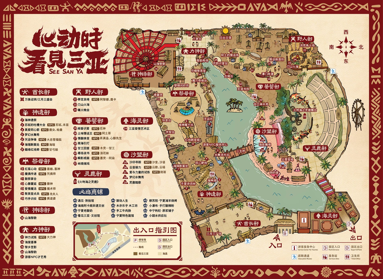 地图页设计呈现原始部落感,手绘一幅十大部落百景图。背面攻略页侧重实用性,是游客必备的漫游指南。